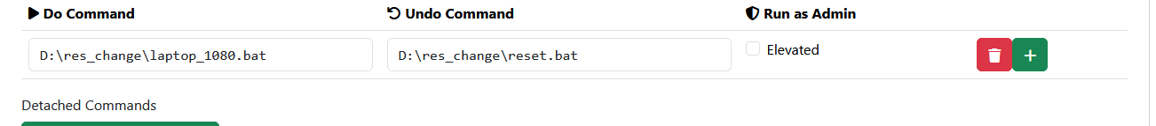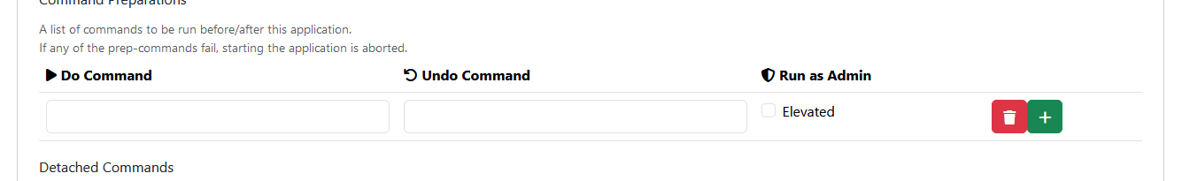 Now we will add these scripts as commands in Sunshine so they execute before we load our game, desktop or Playnite. Return to Sunshine and navigate to the application you setup. Go to the "Command Preparation" section, click the green "Add Commands" button. Your screen will now look like this: