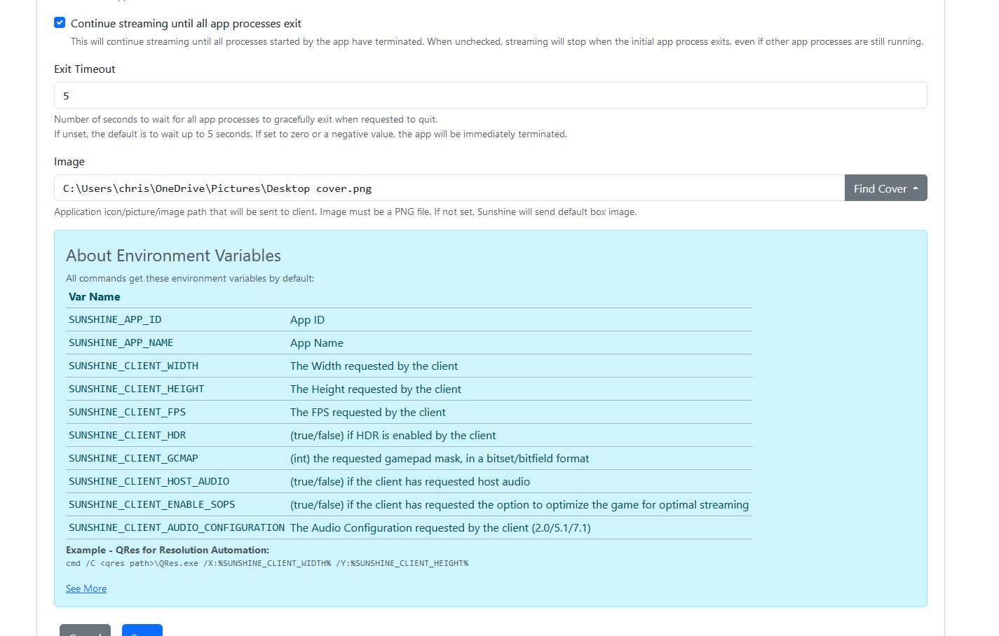 Name the application, leave "Output blank", and leave "Global Prep Commands' enabled. For now we will skip the "Command Preparations" section, we will come back to this later. In the box labeled "Command" you will put the path to the game or application you want to launch. To simply launch your desktop leave the box empty. "Working Directory" is not required for most software. Scroll down a little further and you will see an empty box labeled "Image". This is where you will put box art that will appear in the Moonlight client.