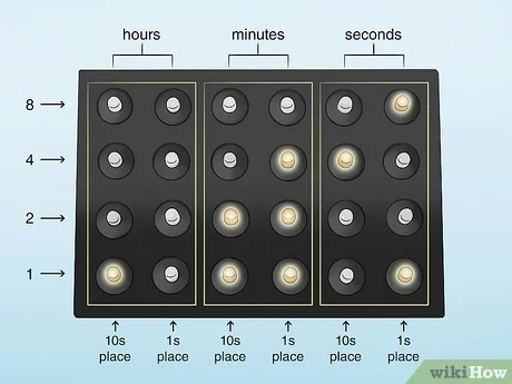 Each column corresponds to a specific unit of time (hours, minutes, or seconds), with the HH:MM:SS format, and each light represents a 0 or a 1, and the position of the light in the Y-Axis tells its decimal number, which you then add up!